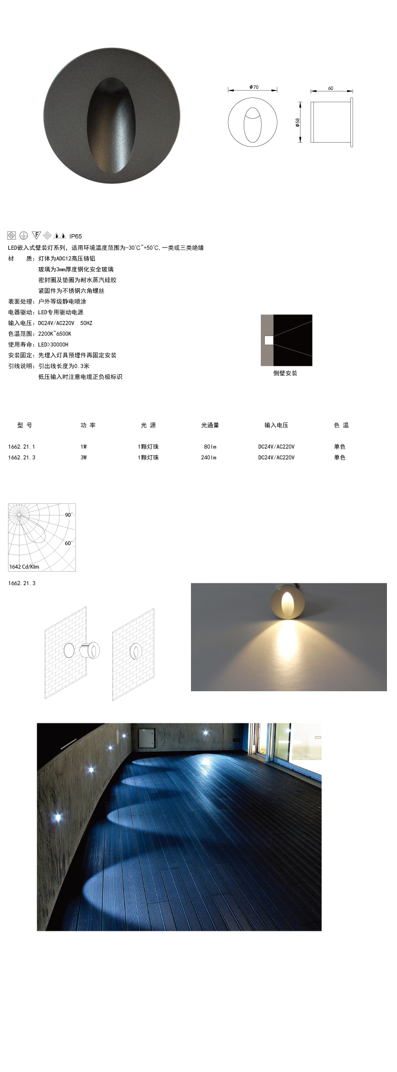直徑70mm斜口下照圓形嵌入式壁燈1或3W